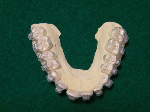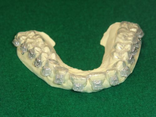 ごきそ歯科の2次治療、成人矯正(マルチブラケットシステムを利用した治療)では、歯型の上でブラケットを並べてトレーを作り、トレーを使って歯に正確にブラケットを付ける、インダイレクトボンディングテクニックを採用しています。歯型の上で正確に並べたものを歯の上に再現するので、治療期間の短縮につながります。